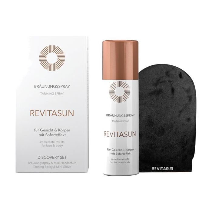 Um die Haut optimal auf das Bräunungsspray vorzubereiten, zunächst das Peeling anwenden. Der beste Zeitpunkt zum Bräunen? Nach dem Duschen auf gut abgetrockneter Haut nach der Pflegeroutine. Vor dem Auftragen von Bräunungsprodukten, die Feuchtigkeitspflege nicht vergessen! Nimm dir Zeit für deine Bräunungsroutine. Einen Haartrockner verwenden, damit das Bräunungsspray schneller trocknet. Für ein intensiveres Bräunungsergebnis täglich anwenden. Bräunungsprodukte bieten keinen Sonnenschutz. Um sich vor Sonneneinstrahlung zu schützen, empfiehlt sich nach der Anwendung des Bräunungssprays das REVITA SUN Marula Oil Beauty Elixir mit LSF 30 aufzutragen. Der Mini-Handschuh ist bis 30°C in der Maschine waschbar. Um Produktablagerungen im Sprühkopf des Bräunungssprays vorzubeugen, sollte dieser nach jeder Anwendung gereinigt werden. Dafür den Sprühkopf von der Dose lösen und mit warmen Wasser ausspülen.